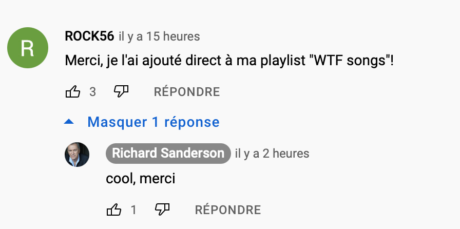Y a vraiment des gens qui sont déconnectés du réel. Y a rien de touchant, tout est nul, aucun gout, et je suis vraiment contente de partager cette merde avec mes amis, faut bien rigoler. Ce commentaire et la réponse du "compositeur" : ![]() ![]() Edit : Richard Sanderson c'est le chanteur de Reality dans La Boom °_O mais aussi de ... ah bah non c'est tout.