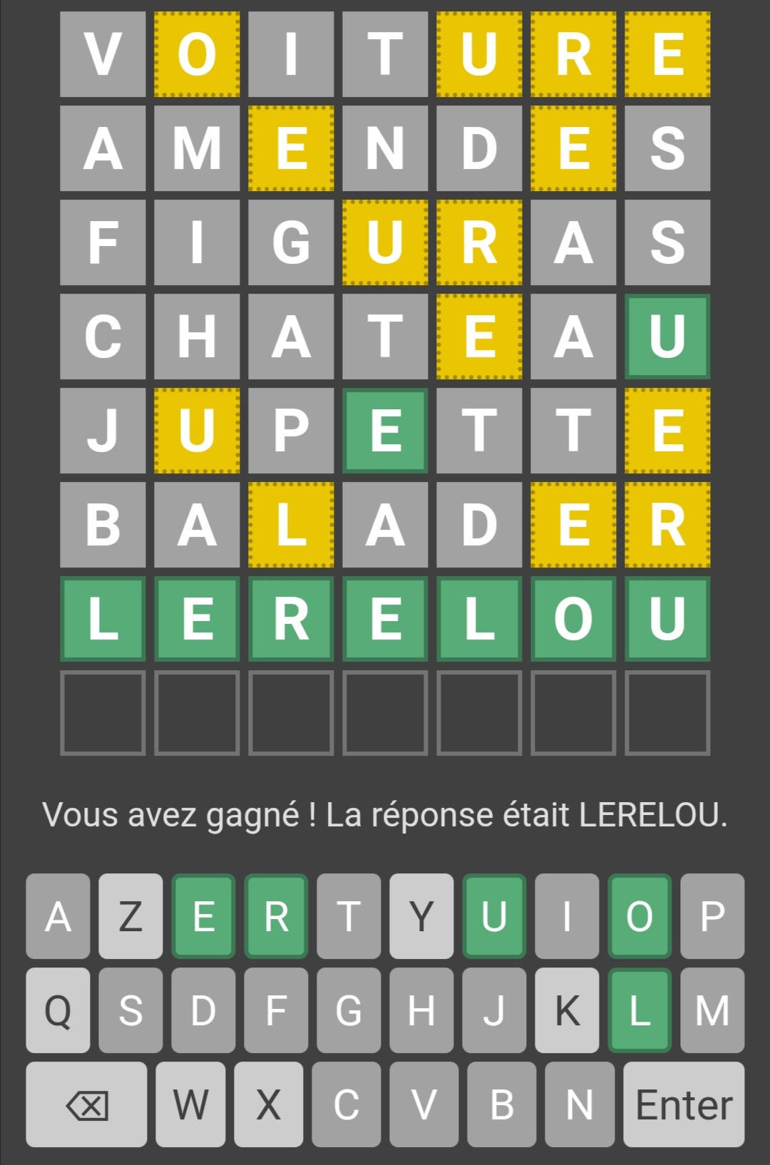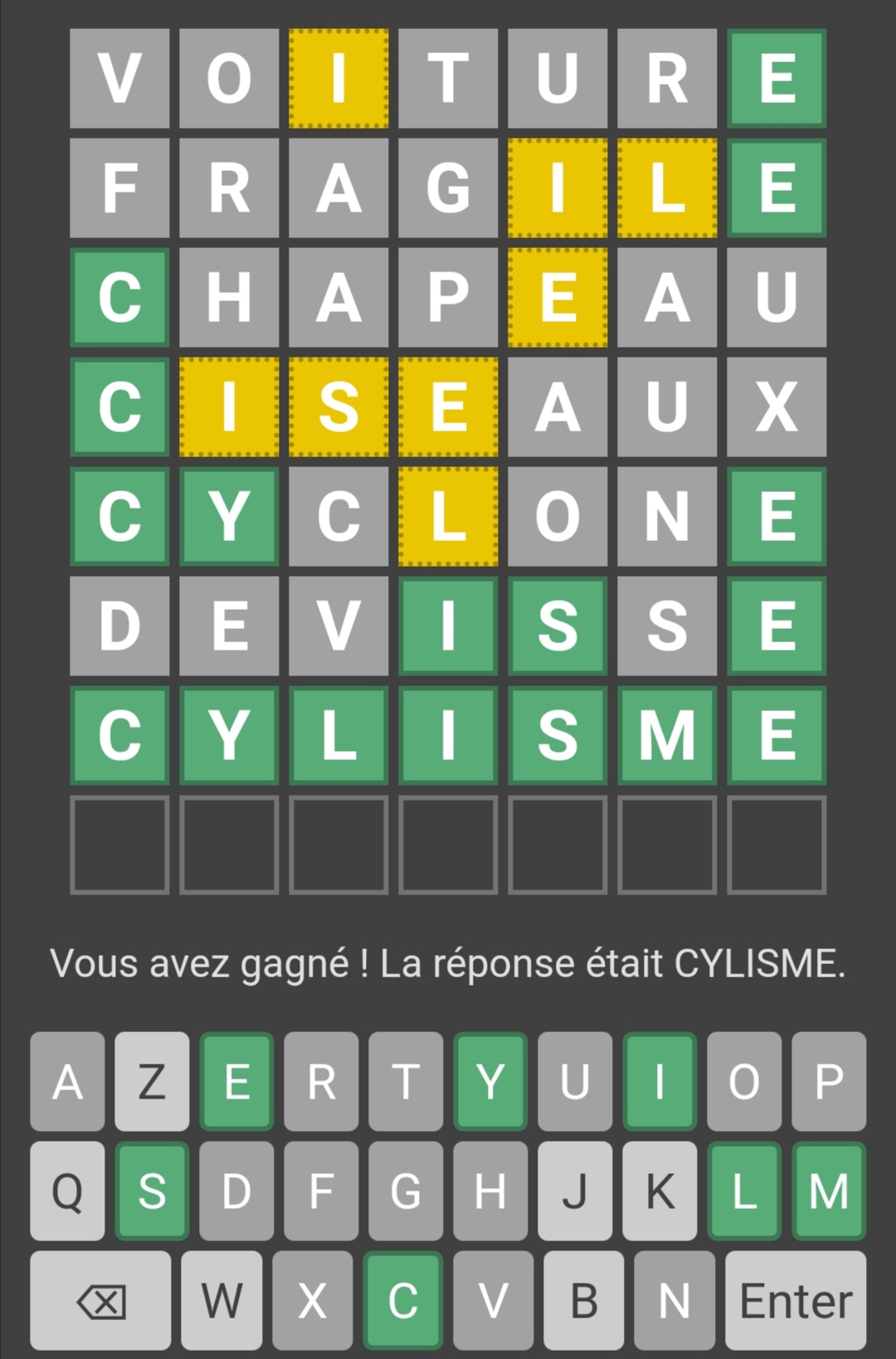 Ce qui est marrant c'est que sur les 6 premiers essais, je savais pas du tout quel mot c'était (j'avais juste les deux dernières lettres). Au 7ème essai j'ai eu une épiphanie et j'ai eu juste ![]()