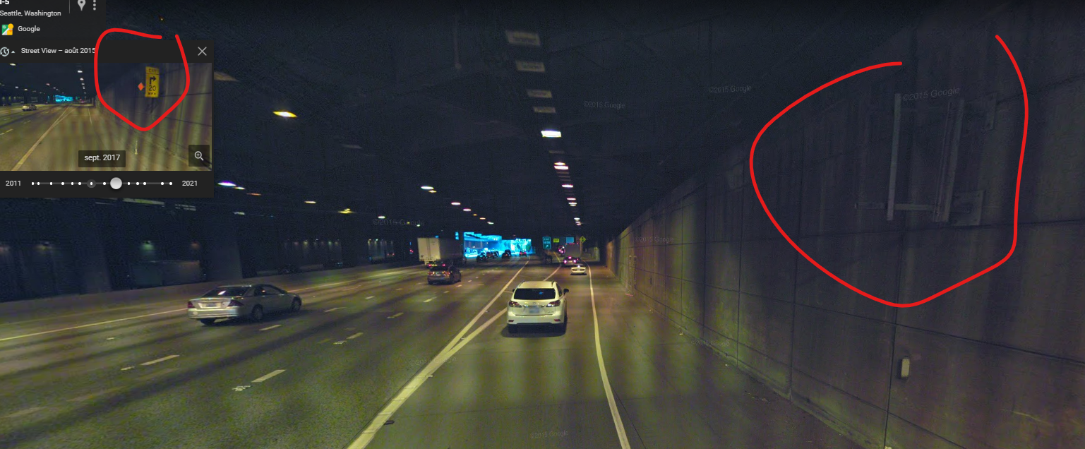 Sortie de tunnel en virage vue google street view sortie de l'autoroute I-5 vers Union Street à Seattle. Très probablement, les gens accélèrent et prennent la courbe à une vitesse trop élevée, perdant le contrôle ![]()