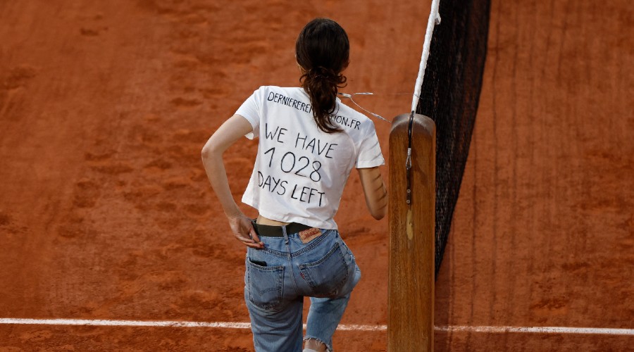Une militante écologiste s'attache au filet lors de la demi-finale de Roland-Garros entre le Norvégien Casper Ruud et le Croate Marin Cilic. Il a fallu quatre vigiles pour décrocher la jeune femme. Le match a été interrompu pendant une dizaine de minutes.