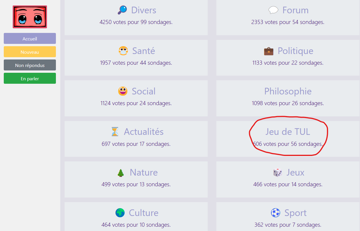 @Le_Relou Les sondages de la catégorie "Jeu de TUL" n'apparaissent qu'au sein de cette catégorie, pour éviter que ceux qui ne connaissent pas le jeu tombent par hasard dessus et ne comprennent rien à ce qu'on leur demande.