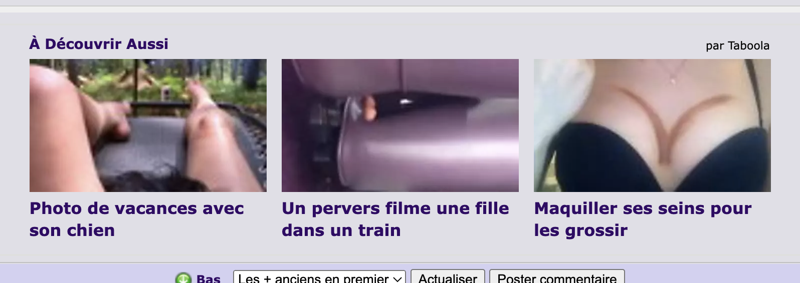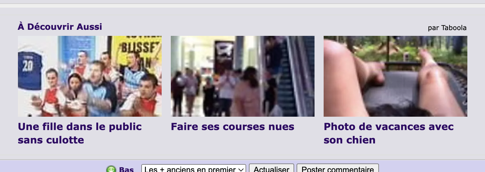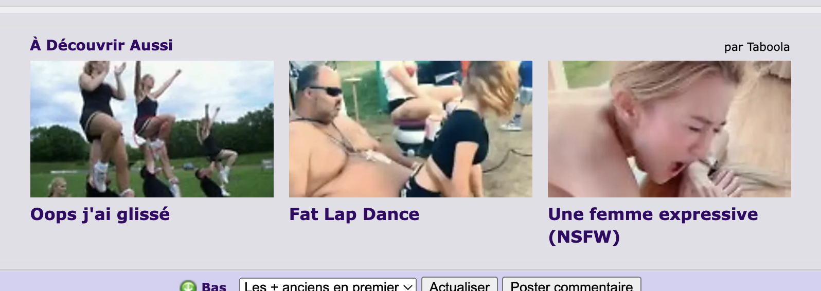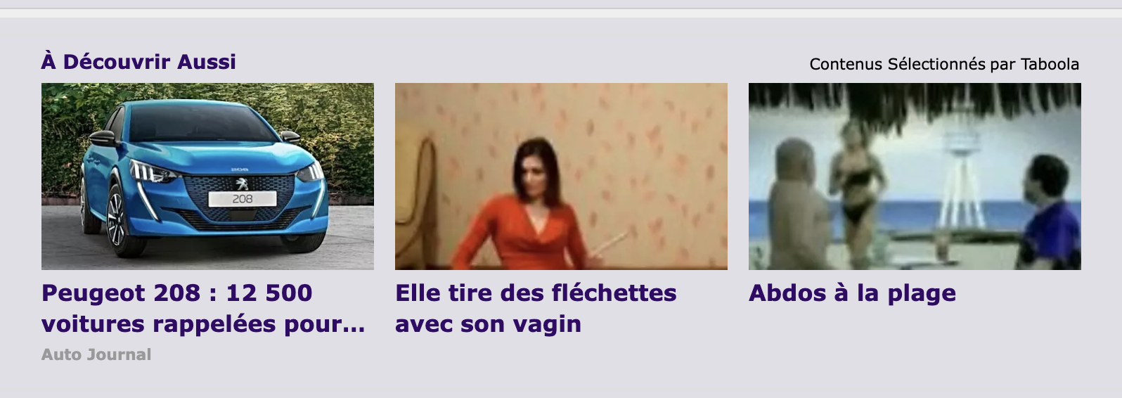le côté sexiste / pervers en 2022 est assez atroce, mais bon, le sujet sur la 208 m'interesse (spoiler: non :D) ![]() ![]() ![]() ![]() ![]() ![]() ![]() ![]() ![]() Je suis sur mon ordinateur professionnel, peu de chance que ces suggestions soient liées à mes préférences de navigation. Vu que les pubs sont le sujet du mois, il y aurait-il moyen de gerer un filtre pour les publicités taboola? Pour l'image de Koreus.com c'est pas top.. edit: oh god, ca renvoit en fait sur des articles koreus; ca craint, un peu de nettoyage en 2022 ne ferait pas de mal. La plus choquante étant celle du "deshabilleur fou"