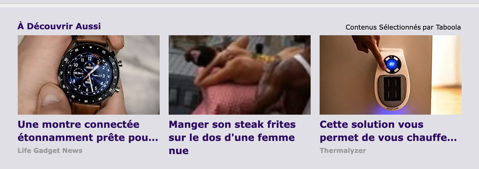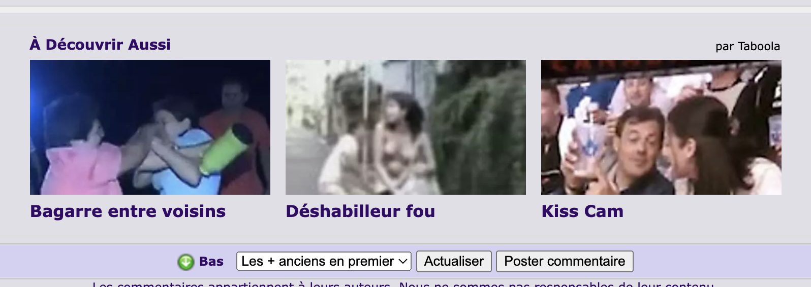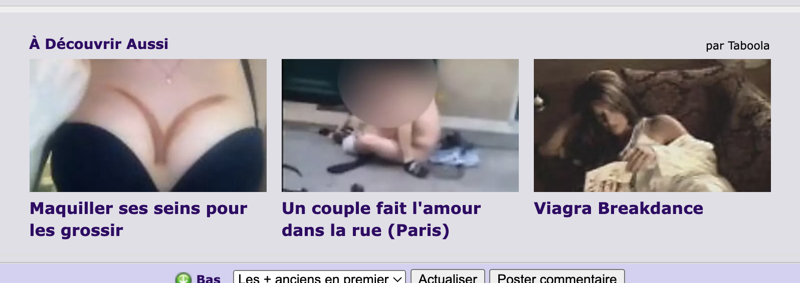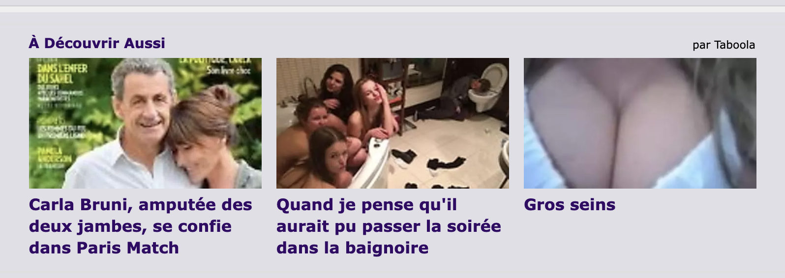 le côté sexiste / pervers en 2022 est assez atroce, mais bon, le sujet sur la 208 m'interesse (spoiler: non :D) ![]() ![]() ![]() ![]() ![]() ![]() ![]() ![]() ![]() Je suis sur mon ordinateur professionnel, peu de chance que ces suggestions soient liées à mes préférences de navigation. Vu que les pubs sont le sujet du mois, il y aurait-il moyen de gerer un filtre pour les publicités taboola? Pour l'image de Koreus.com c'est pas top.. edit: oh god, ca renvoit en fait sur des articles koreus; ca craint, un peu de nettoyage en 2022 ne ferait pas de mal. La plus choquante étant celle du "deshabilleur fou"