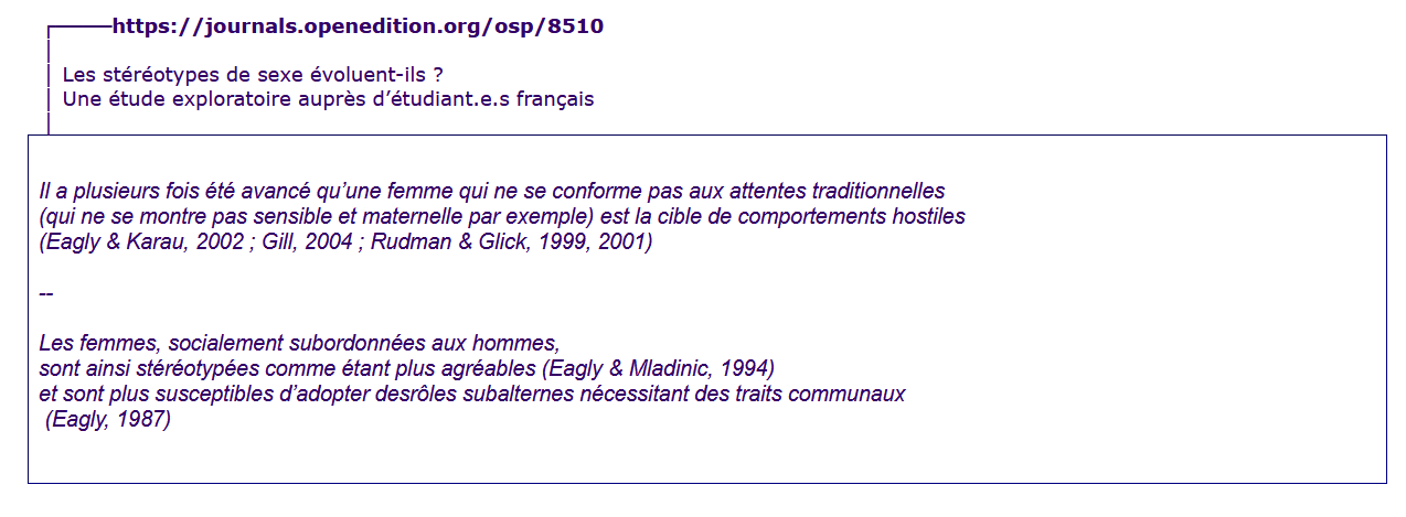 ![]() Tu remarques qu'il y a des noms écrit entre parenthèse sous ce que tu mentionnes c'est sensé être les noms des chercheurs.se et les années des publications. J'ai déjà fait assez de recherche pour ces sujets et sur ce topique en général. D'instinct ( et de logique aussi ) je dirais la foule ( sans distinction H/F ) fessant partie d'une société. Et comme exemples certains des échanges du topique sur les commentaire que les femmes peuvent recevoir lorsque' elle affirment ne pas vouloir d'enfant ou vouloir une contraception définitive.