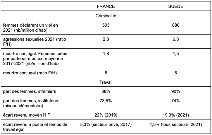 Les Français baignent-ils dans la culture du viol ? Les Françaises subissent-elles une oppression systémique ? Nous avons voulu, en savoir plus. ![]() ---- Eléments de comparaison avec un pays fer de lance de l'égalité hommes-femmes : la Suède. ![]() https://bra.se/statistik/statistik-utifran-brottstyper/valdtakt-och-sexualbrott.html https://www.interieur.gouv.fr/actualites/actu-du-ministere/etude-nationale-sur-morts-violentes-au-sein-du-couple-2021 https://www.scb.se/hitta-statistik/sverige-i-siffror/utbildning-jobb-och-pengar/yrken-i-sverige/ https://drees.solidarites-sante.gouv.fr/publications/etudes-et-resultats/la-profession-dinfirmiere-situation-demographique-et-0 https://www.radiofrance.fr/franceinter/les-plaintes-pour-violences-sexuelles-ont-augmente-de-33-en-2021-1344830 https://www.insee.fr/fr/statistiques/6047789?sommaire=6047805 https://www.mi.se/publikationer/loneskillnaden-mellan-kvinnor-och-man-2021/ https://www.insee.fr/fr/statistiques/4514861/ https://fr.statista.com/infographie/amp/17748/niveaux-de-pauvrete-en-france-et-en-europe/ https://www.francetvinfo.fr/societe/les-femmes-pauvres-plus-battues-que-les-autres_1632389.html Commentaires **criminalité : Les femmes suédoises déclarent bcp + de viols que les françaises, et les femmes suédoises déclarent bcp + d’agressions sexuelles que les hommes suédois. La libération de la parole joue sûrement un rôle, cependant 1. l’écart est conséquent et 2. la libération de la parole devrait aussi bénéficier aux hommes agressés. Il y a moins de femmes suédoises tuées par le partenaire, sachant qu’on est dans la marge d’erreur statistique (population suédoise : 10M). Le ratio F/H pour les victimes de meurtres conjugaux est identique dans les deux pays. Il y a en Suède 4 fois moins de pauvres (en % ) qu'en France, ce qui a probablement un impact sur les violences conjugales. En effet la violence est 4 fois plus présente chez les plus pauvres par rapport aux plus riches. On pourrait agréger les statistiques des autres pays scandinaves pour avoir un échantillon plus fourni. **travail : Les 2 métiers réputés féminins les plus emblématiques ont une proportion de femmes identiques en France et en Suède. L’écart de salaire moyen est légèrement plus faible en Suède, probablement à cause d’une différence de proportion des temps partiels entre les deux pays. Les écarts salariaux à poste et temps de travail égal sont proches dans les deux pays. -- D'après le rapport annuel 2023 sur l'état des lieux du sexisme en France, par le Haut Conseil à l'Egalité entre les femmes et les hommes : Citation : Malgré des avancées incontestables en matière de droits des femmes, la situation est alarmante.