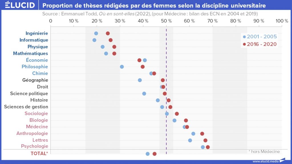 - les femmes dominent les secteurs producteurs d'idéologie (sociologie, psychologie, lettres, anthropologie)