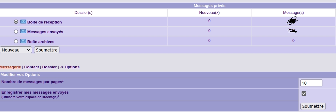 pour enregistrer les messages envoyés , il faut aller dans Messages options et activer l'enregistrement des messages envoyés en cochant la case , puis soumettre sinon effectivement les messages envoyés ne sont pas stockés ![]()