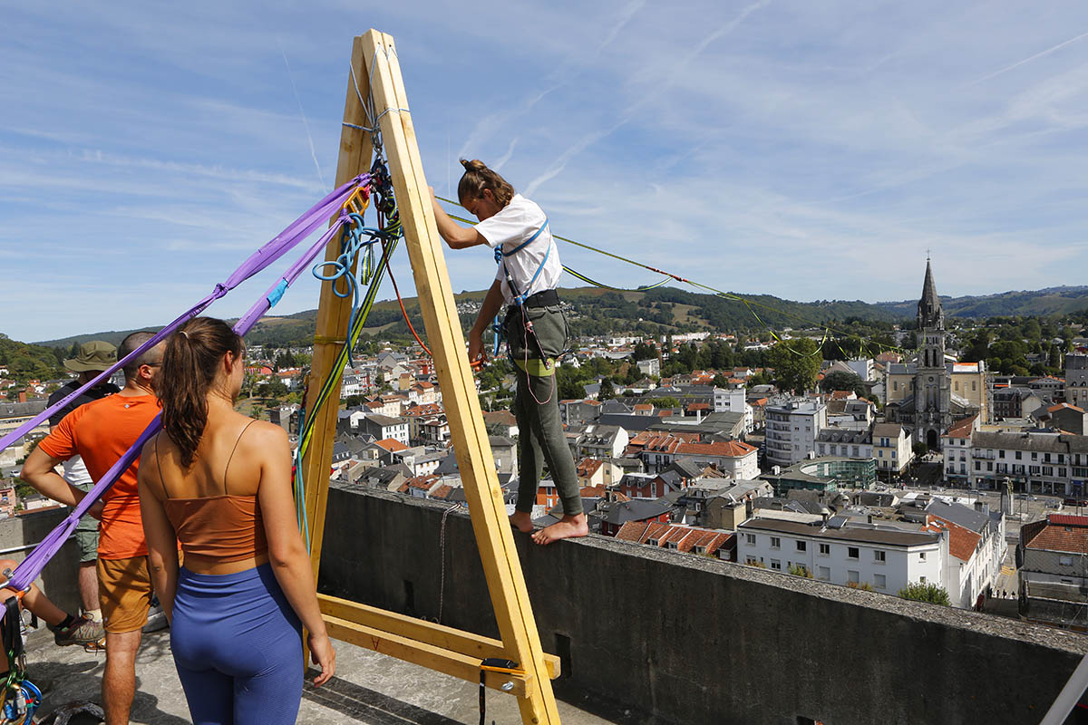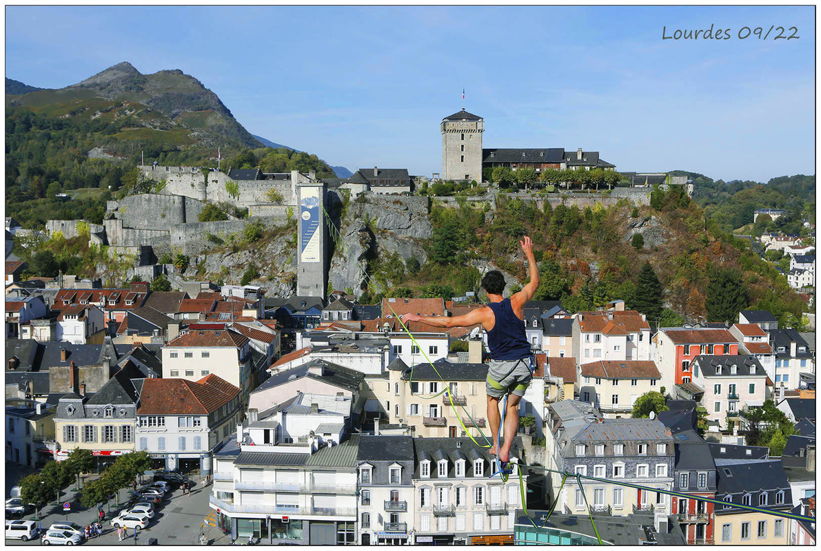 Un petit clip sympa d'une démonstration de highline 40m au-dessus de la ville réalisée cet automne par l'assos Slackline Pays Basque, dans le cadre du centenaire du musée pyrénéen hébergé dans le château fort de Lourdes. Un évènement urbain très spectaculaire et très rare qui, bizarrement, est passé plutôt inaperçu dans les médias ! (vidéo d'OvershotMedia, photo perso)