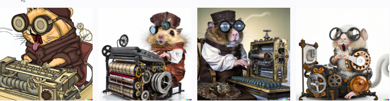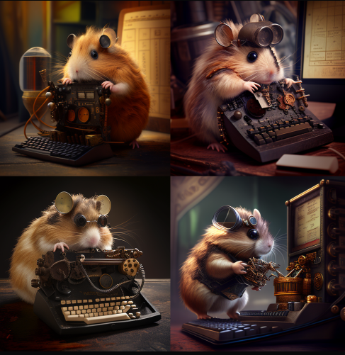 | Je masterise !    Inscrit: 16/01/2009 09:06 Post(s): 3527 Karma: 2878 | @Baba-Yaga Ah OK ! Alors ça on peut ? @Koreus pour un design, j'adore le style Steam punk   "A mad geek hamster typing on a steampunk computer" Version Dall-E :  Version Midjourney :