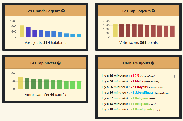 Changements graphiques - Dans la section Joueurs, dans les classements en bas de page: vous pouvez dorénavant consulter votre propre score. - Dans la section principale, dans les modules d'ajout d'habitants: vous pouvez dorénavant consulter votre % de critique , par Tier.Pour rappel, ce taux évolue en fonction de votre avancée dans la découverte de succès. Le % s'applique à chaque ajout. Previews: (Vous voyez mes scores en dessous des graphes) ![]() (Vous voyez mes % de pour chaque tier)![]() -------------------------------------------------------------- Le sondage a été pris en compte. Vous avez tranché! Un évènement tragique à eu lieu, ciblant les militaires.