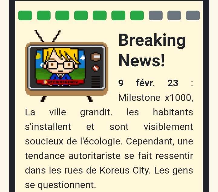 Les efforts ont payé, notre morale et notre santé sont revenues dans le positif. J'ai tenté d'améliorer nos finances ce matin, notamment en faisant un choix difficile, Spoil sur des T3 : (j'ai préféré rajouter un 7e athlète dans la ville plutôt que de me laisser tenter par la création de mon premier prisonnier) ce serait bien que nos finances reviennent au plus haut si on ne veut pas sombrer dans la misère sociale !
