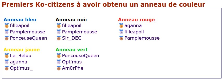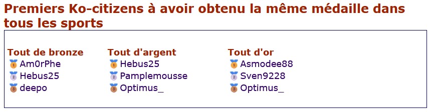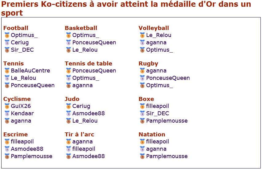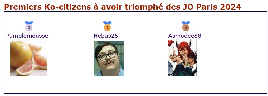 ![]() L'événement ce termine ce soir ! Merci à tous pour votre participation ! Voici quelques stats et classements intéressants. Les JO Paris 2024 des @Ko-citizens ce sont: 2163 820 274Premiers Ko-citizens à avoir atteint la médaille d'Or dans un sport Premiers Ko-citizens à avoir obtenu un anneau de couleur Premiers Ko-citizens à avoir obtenu la même médaille dans tous les sports Premiers Ko-citizens à avoir triomphé des JO Paris 2024