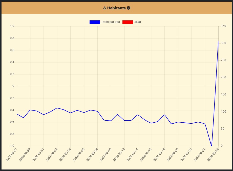 https://www.koreus.com/modules/newbb/topic241380-40.html#forumpost2992259 ça vous fait quand même perdre beaucoup d'habitants au final. Mais c'est une manière d'arriver à une date avec plus de 3 habitants. EDIT: En fait c'est surtout intéressant pour commencer un événement avec 15-20 habitants directement et d'être moins contraint par le temps. Disons que sur 30 jours d'événement, tu peux générer que 30*3+3*11= 93 habitants (de tête). Si tu accumules pendant 10 jours avant l'événement en récupérant simplement les récompenses de connexion et sans jouer, tu passes à 93 + 1*11 = 104 habitants. C'est un petit plus. PS: ![]() ![]()