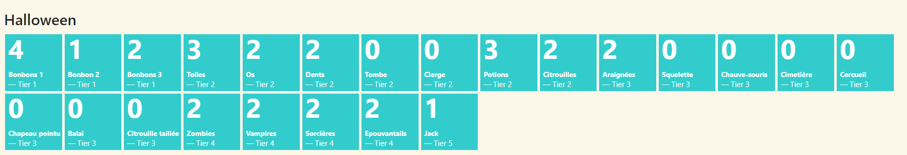 je vous donnerai le nombre d'éléments pour chaque Tier et le nombre de succès le 15 octobre.