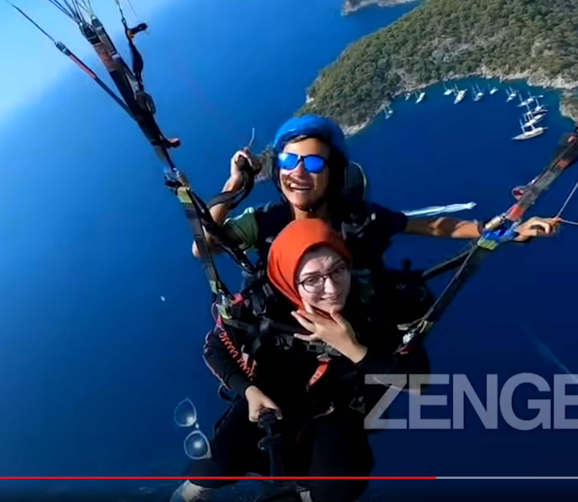 Alors qu'elle faisait du parapente en binôme cette jeune femme à perdu les verres teintés de se lunettes emportées par le souffle de l'air pendant une figure acrobatique (1:06).