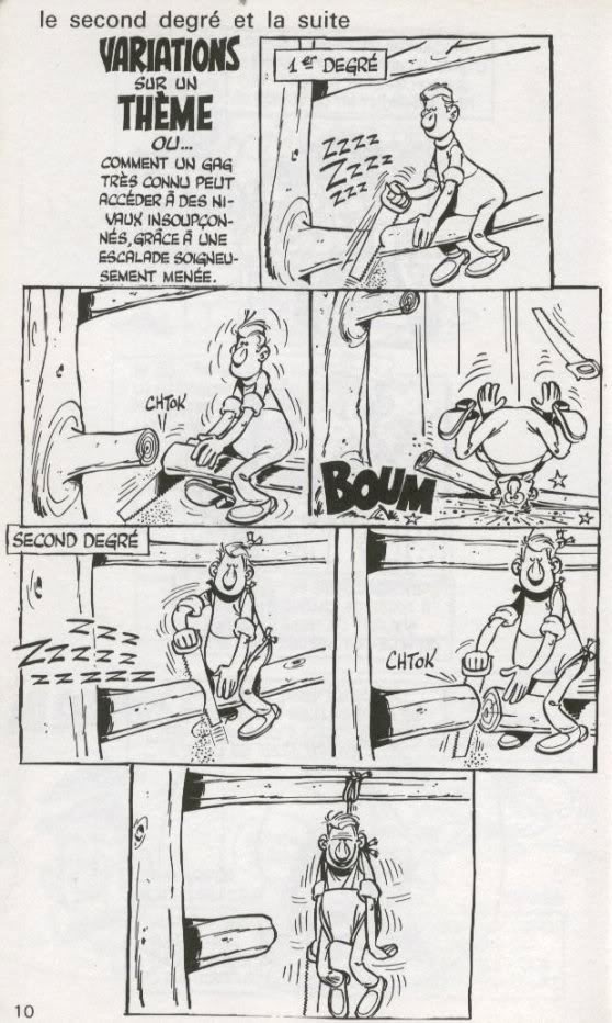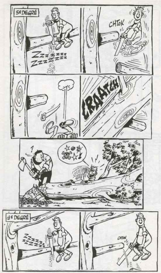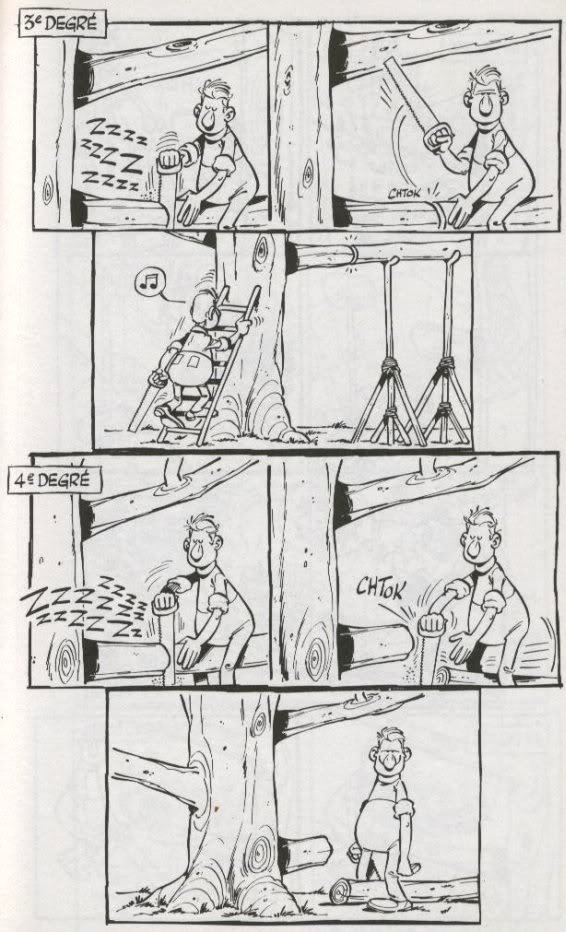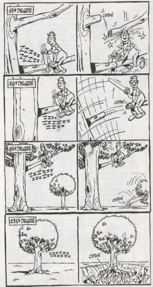 je me suis fait la meme reflexion que toi : qui peut etre aussi debile pour scier une branche sur laquelle il est assis ? bon bah dans la video plus haut, on voit ! (au passage je te conseille la bd rork, y a un theme similaire dans l'une des histoires courtes des deux premiers tomes). puis y a eu Gottlieb ! en revanche, autant je suis fan de lui, que je me suis surpris à attendre une blague avec l'arbre à 45° 90° 180° et même 360° et un peu déçu de ne pas les avoir vu. Dommage.