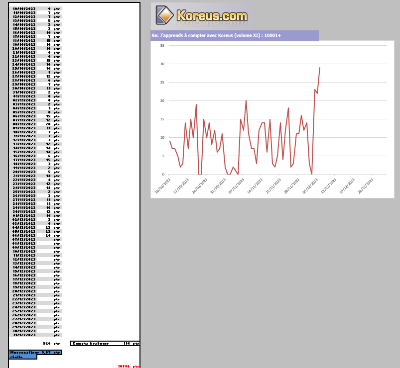 ![]() Edit point sur les stats : Malgré une participation journalière en dent de scie (voir tableau ci-dessous), nous venons de vivre 3 jours exceptionnels, avec comme point d'orgue les 27pts d'hier (record) ![]() Le défi qui nous était proposé par @Baba-Yaga est en train de se concrétiser grâce à vous (un peu grâce à moi aussi ^^) Actuellement nous sommes sur une moyenne de 9,07messages/jour, bien supérieur au 7,80messages nécessaire. Sans trop m'avancer, je pense que nous pourrons tous profiter du réveillon le 24 au soir, le cœur léger, l'esprit soulagé avoir réussi notre MISSSION. Mais je m'emballe un peu trop, nous touchons au but, mais un dernier effort collectif est nécessaire. 11000 nous voilà ![]()