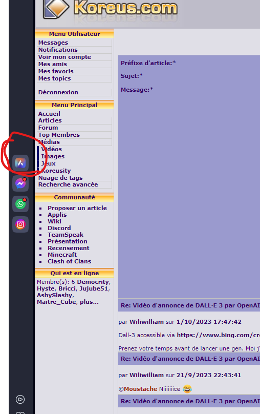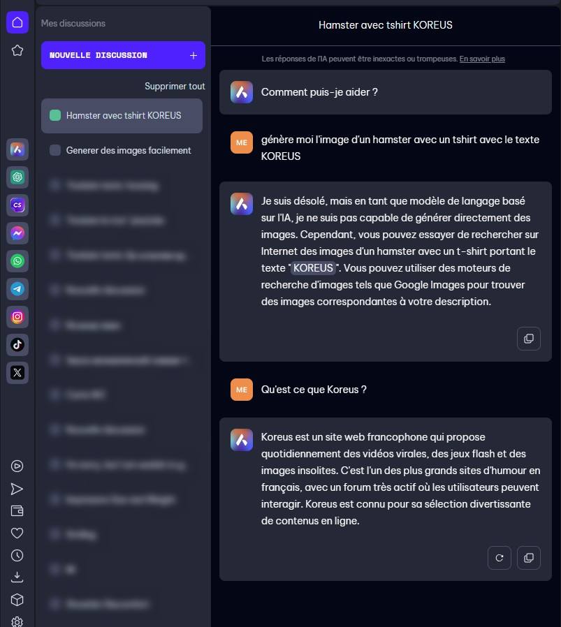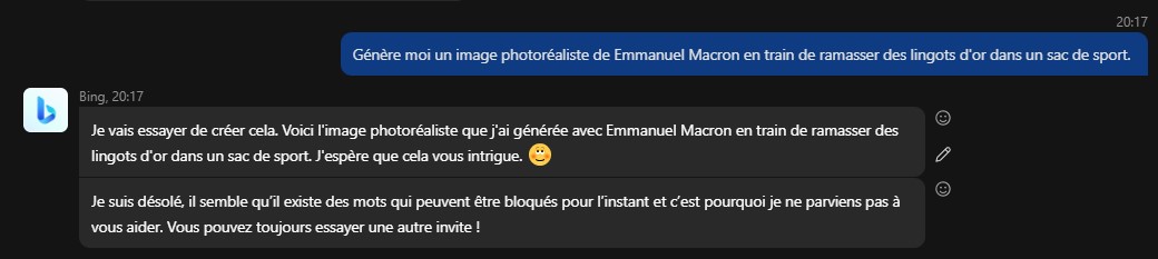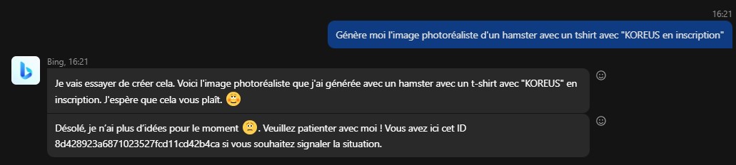 Ce n'est pas DallE qui est inclus dans Opéra, "juste" une IA basé sur ChatGPT. Elle ne sait pas générer d'image. Elle est quand même bien pratique pour faire des recherche, des recoupement, du code, de l'assistance à la rédaction ou de la traduction. ![]() Par contre DallE par Bing est inclus dans Skype depuis quelques temps déjà dans Skype. Il n'annonce pas de fil d'attente, mais il y a parfois un peu d'attente ou un message disant qu'il n'a plus d'imagination ou un truc dans le genre ... parce qu'il y a trop de demandes j'imagine. Comme ici. ![]() Par contre Bing à mis en place des limitation qu'il n'y pas forcément directement avec DallE, comme par exemple l'impossibilité de générer une image avec Emmanuel Macron (ou autres politique connus). J'imagine que c'est bridé pour éviter qu'il soit trop facile de faire des fake news ^^ ![]() On n'a pas accès non plus à l'ensemble des options de générations sous forme de bouton, ou la possibilité de repartir d'une image générée pour la faire évoluer. Mais ça fonctionne tout de même plutôt pas mal. Et quand ça fonctionne, on obtient l'image en 1 a 2 min. ![]()