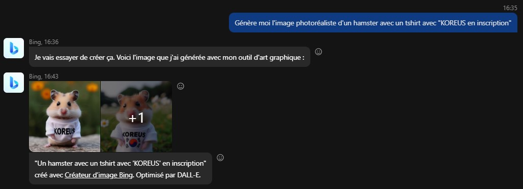 C'est bien pour ça que je dis que ce n'est même pas DallE qui est inclus dans Opéra. "Juste" une ia de génération de texte. Pour ce qui est de Skype, je ne sais pas précisément quelle version de DallE est derrière, mais j'ai noté une nette amélioration depuis hier. Avant il était incapable de générer une image avec du texte, il faisait "semblant" d'écrire (comme dans cet exemple ou je lui demandais d'écrire Happy Birthday) ![]() Mais il a fini par accepter ma demande de Hamster avec un Tshirt. Et là, maintenant, il "sait" écrire. ![]() Par contre, je n'avais jamais eu autant de temps d'attente, dans ce cas 8 minutes. Juste pour le plaisir, je vous mets les 3 images en pleine résolution ^^ ![]() ![]() ![]()