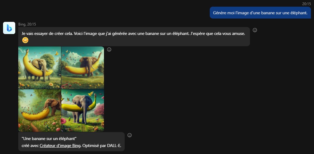 Même si c'est plus un éléphant sur une banane qu'il a fait qu'une banane sur un éléphant à @Djoach En voyant ta 3e capture, j'avais eu une dispute une fois avec ChatGPT pour lui demander pourquoi il conseillait Google alors qu'il appartient à Microsoft et qu'il devrait plutôt conseiller le moteur de recherche de son patron! Il m'avait répondu qu'il ne faisait pas de publicité et que Google était le plus utilisé. Alors je 'lui ai fait remarquer qu'il faisait bien de la publicité pour Google du coup, et il était tout penaud, bien fait pour lui, méchant robot! @Maitre_Cube Oui je sais mais c'est récent et puis j'utilise une plus ancienne version d'opéra (73 pour Android) parce que je n'aime pas l'apparence des nouveaux. (sauf sur une de mes 3 tablettes où je l'ai mis pour voir (et oui je suis un dingue des tablettes!))