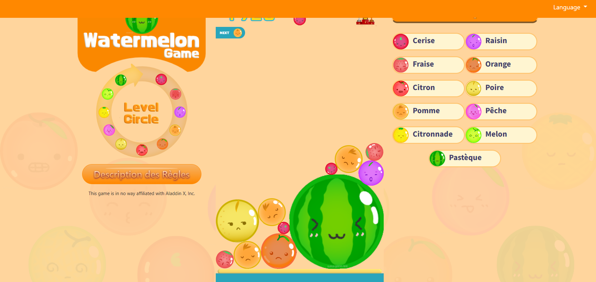 >>> Jouer à Suika <<< Synopsis: Il s'agit d'un jeu dans lequel vous combinez deux petits fruits pour les rendre plus gros et créer de grandes pastèques. Comment Jouer: • souris Genre: #Casse-tête#Fête#fruits#réflexion#mais surtout de la chance Bon jeu! Je n'ai jamais passé la barre de 1 "Melon" et 2 "Lemonades" qui ne se touchent pas ![]() Le jeu existe sur Switch, et c'est visiblement la petite addiction de certains streameurs en ce moment.