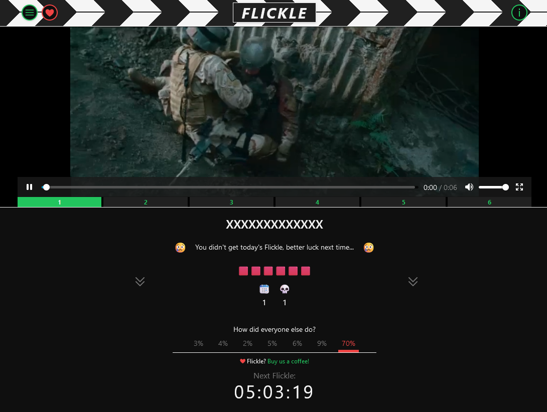 ![]() Flickle Jouer au jeu Le principe : deviner un film ! A chaque erreur, un nouveau clip du film est révélé. Chaque jour, un nouveau film doit être trouvé. (Pas évident aujourd'hui je l'ai pas eu. J'ai mis des 'X' pour masquer le titre du film)C'est dans la même veine que 1 jour 1 film.