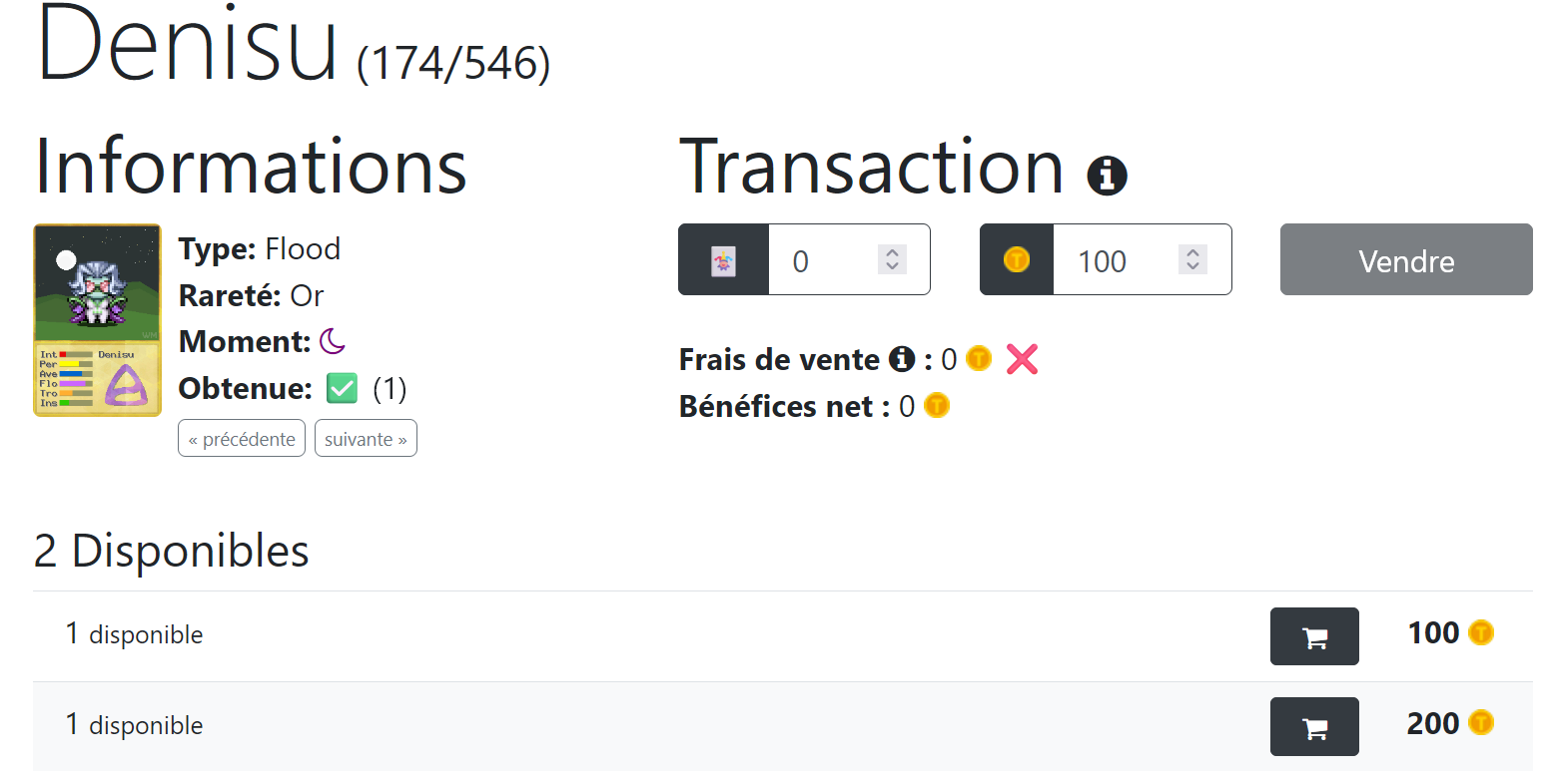 ![]() Qui c'est qui vend ses cartes OR à 200 tokens ? Non par ce que après on se retrouve avec des Deck Gold avec 1 seule carte OR. à 400 le deck ça fait pleurer pour recuperer les 100 cartes OR qui restent à trouver. (et même si on essaye d'améliorer avec des cartes Argent) @Wiliwilliam s'il te plait ça serait possible d'augmenter la probabilité d'avoir des cartes OR uniques et au moins 3 cartes OR dans un DECK Gold