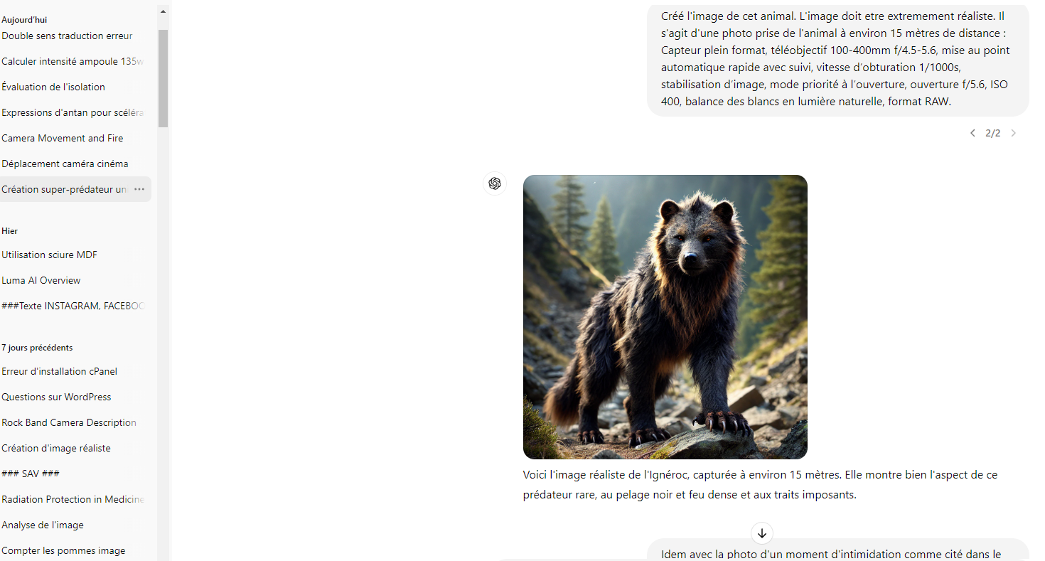 Pour quelques exemples : - Clairement pour moi, c'est devenu un réflexe. En ce moment, je regarde Dr House avec madame avant de dormir. Il parle d'un terme technique, je lui demande de vulgariser pour mieux comprendre, pouf c'est intégré et compris. - Je rejoins @Wiliwilliam pour la traduction. Au-delà de traduire, il va comprendre tes intentions et traduire en fonction. Il ne va pas, par exemple, traduire avec un mot à double sens bêtement voici un exemple généré par GPT lui-même : Voici un autre exemple avec le mot "livre." En français, "livre" peut signifier un livre (un ouvrage) ou une unité de poids (livre, équivalent à environ 500 grammes). Exemple de phrase en français : "Il a acheté une livre de pommes et un livre sur la cuisine." Traduction possible par un traducteur automatique : "He bought a book of apples and a book on cooking." Le traducteur pourrait mal interpréter le contexte et traduire les deux "livre" comme "book," alors que le premier "livre" devrait être traduit par "pound.") - J'ai recréé le jeu SNAKE, PONG, et aussi un pseudo casse-brique en HTML sans connaître le langage HTML (ou même le codage d'un point de vue général). - J'ai créé un jeu de recherche d'objet dans une image rétro (par exemple, il faut chercher l'objet indiqué dans l'angle de l'écran et cliquer dessus quand on l'a trouvé). - Je m'en suis servi pour mettre un pop-up sur l'accueil de mon site internet. - Je m'en sers pour des loisirs (j'ai imaginé un animal fictif découvert par un reporter fictif qu'il m'a aidé à créer et à "romancer," puis à le créer en image. D'ailleurs, ce n'est pas du tout terminé. Il faut que je retravaille tout ce qu'il y a à partir du chapitre "3 ans pour traquer..."). - Je m'en sers parfois pour raconter des histoires à ma fille avant de dormir. Elle me donne le contexte, puis je demande à ChatGPT de faire le reste, c'est parfois vraiment marrant : "Alors c'est la reine des neiges qui mange un caillou et là elle peut se transformer en rocher et elle saute d'un bateau pour aller attaquer le monstre sous-marin...etc." - Rédaction de courriers/mails pro et perso. - Je me suis fait des textes normalisés à envoyer à mes clients dans le cas d'un SAV par exemple (je peux modifier ce texte et le personnaliser en fonction de la problématique, ce qui me permet d'envoyer quelque chose avec la même "forme" et toujours un rendu très professionnel), ou encore pour poster sur Instagram, Facebook, etc., pour optimiser le référencement Google de mon site aussi. - Concernant les IA d'art, je m'en sers pour la création de graphisme en complément de Photoshop (la dernière version intègre une IA). Au besoin, on se sert de Midjourney pour du 100% création graphique IA. - Et plein de conneries aussi... Voici une toute petite partie de mon historique de conversation ChatGPT ainsi que la photo de l'Ignéroc, le super-prédateur ! ![]() "### L’Ignéroc : Le Super-Prédateur que Personne n’Avait Vu Venir **Par Pierre Rouvet, Naturaliste et Reporter Animalier** --- ### À Propos de l’Auteur Pierre Rouvet est un naturaliste chevronné et reporter animalier renommé. Depuis plus de deux décennies, il arpente les écosystèmes les plus reculés de la planète, à la recherche de phénomènes rares et de comportements insoupçonnés au sein de la faune sauvage. Ses travaux ont été publiés dans les revues les plus prestigieuses, et ses documentaires ont captivé des millions de téléspectateurs. Véritable passionné, Pierre est également connu pour ses méthodes rigoureuses et son approche scientifique de l’observation animale. ### Une Mission de Quelques Semaines qui a Changé de Cap À l'origine, je ne me trouvais dans les montagnes de l'Altaï que pour une mission courte, une étude de quelques semaines destinée à évaluer l’impact du changement climatique sur les dynamiques de prédation dans cette région. Mon objectif initial était de documenter comment les espèces locales s’adaptent aux variations de températures et à la raréfaction des ressources. Ce secteur, relativement isolé, présentait des conditions idéales pour observer des comportements à l’état pur, loin de l’influence directe de l’Homme. Les premières semaines se sont déroulées comme prévu : relevés de températures, observation des cycles migratoires, installation de caméras-pièges, et prélèvement de divers échantillons biologiques. Cependant, à mesure que j’analysais les données, un ensemble de signaux incohérents a éveillé ma curiosité. C’est là que tout a basculé. ### Un Déséquilibre Écologique Presque Invisible Mon point de départ était une anomalie que j’avais remarquée dans les comportements des populations locales de proies et de prédateurs. À première vue, tout semblait en ordre : les cerfs, les mouflons, les renards et autres espèces se maintenaient à des niveaux proches des moyennes historiques. Cependant, en analysant les comportements de fuite et les patrons de stress physiologique via des échantillons de poils et de déjections, quelque chose ne collait pas. L’analyse des taux de cortisol, une hormone liée au stress, chez les herbivores, a été l’un des premiers éléments qui m’a mis sur la piste. En tant que naturaliste, je disposais d’équipements portables permettant de mesurer ce biomarqueur directement sur le terrain. Ces dispositifs, initialement acquis pour étudier l’impact du changement climatique sur les populations locales, se sont révélés cruciaux dans cette enquête. L’étude des variations de cortisol permet de comprendre comment les animaux perçoivent leur environnement et les menaces potentielles. Au fil des mois, les résultats ont révélé une tendance constante : les niveaux de stress étaient bien plus élevés que ceux attendus pour les espèces confrontées aux prédateurs classiques. Ce phénomène est généralement indicatif d’une menace constante et in
