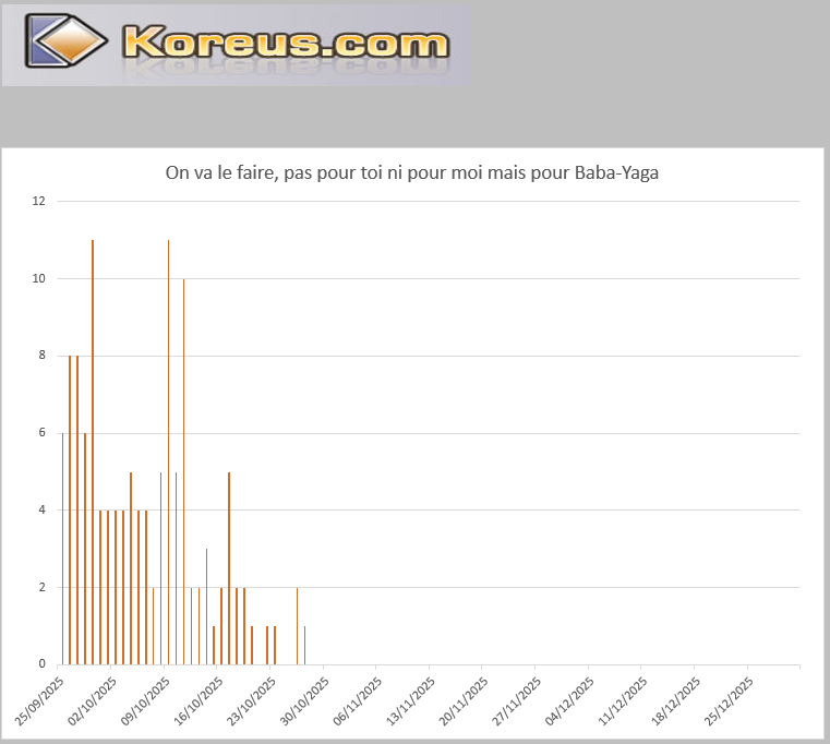 ![]() Un point sur notre avancée, la situation est grave mais pas cata non plus. J'en suis responsable car moins actif depuis le départ de mon ami @Le_Relou ![]() Actuellement nous sommes a une moyenne de 3,60 images/jour pour une moyenne pour atteindre notre objectif de 3,58 images/jour ![]()