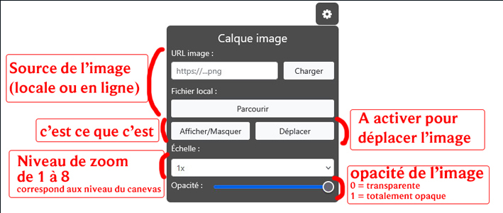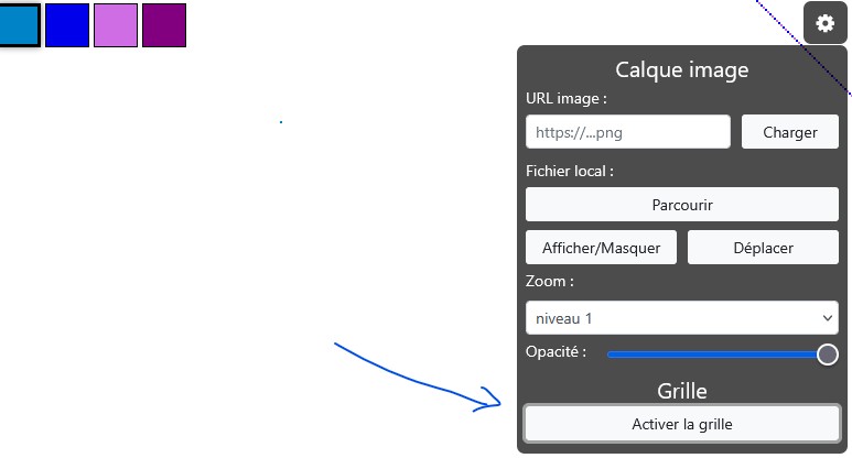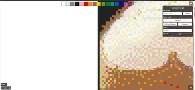 @PixelKoreusiens Cette fonctionnalité vous permet de superposer une image sur le canevas. _ ![]() Vous pouvez importer une image depuis votre ordinateur ou via une URL. Une fois chargée, elle s'affichera automatiquement en haut à gauche de l’écran. Vous avez ensuite la possibilité de personnaliser plusieurs paramètres : • Niveau de zoom : ce paramètre correspond aux différents niveaux de zoom du canevas. Assurez-vous que l'image importée respecte un ratio 1 pixel = 1 pixel, c’est-à-dire qu'un pixel affiché correspond à un seul pixel réel de l'image. Adaptez ce niveau de zoom à celui de votre canevas pour un affichage optimal. • Niveau d'opacité : ce réglage détermine la transparence de l’image, avec une valeur allant de 0 (totalement transparent) à 1 (complètement opaque). Par défaut, il est fixé à 1. Selon la complexité de votre image et vos besoins, il est préférable de ne pas le laisser à 1. • Afficher / Masquer : permet simplement d’afficher ou de cacher l'image. Inutile d’en dire plus ! • Déplacer : par défaut, l'image n'est pas interactive. En activant cette option, vous pouvez cliquer et déplacer l’image librement. Une fois positionnée correctement, désactivez à nouveau le mode pour verrouiller sa position. Il faut comprendre de la position de l'image est fixe par rapport à l'écran, et non le canevas. Ne l'oubliez pas !!! Exemple en situation: Sur l'avatar de Koreus, j'ai superposé cette image au canevas pour avancer sur la zone bas gauche de l'avatar. ![]() ça donne ça après avoir bien superposé l'image. Les pixels déjà posés m'ont servi de repères pour bien caler l'image. La zone rouge correspond à la zone qui n'est pas encore remplie. L'opacité étant réduite, les couleurs sont plus claires. Les pixels entourés en bleus sont incorrectes. Ils sont marrons sur le canevas mais ils devraient être orange/gris. Je m'en rends compte plus facilement en mettant l'image importée en opacité max. et en cliquant plusieurs fois sur masquer/afficher. ![]() L'option fonctionne aussi sur smartphone, mais n'est pas très pratique. N'hésitez pas à tester et poser des questions si vous en avez. Pensez à purger le cache de votre navigateur si ça ne fonctionne pas chez vous. (prochaine étape, la grille de pixels !)