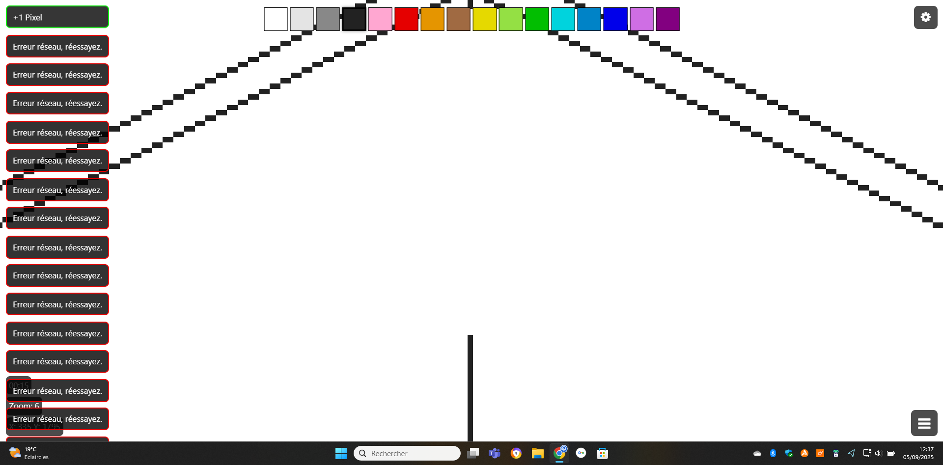 @Kilroy1 Quand tu es sur la page pixelK, fais ctrl + shift + R dans le doute pour purger ta page et les scripts associés. Là tu viens de spam-click pour rajouter un pixel et ça te fait ça? Qu'est ce que tu entends par "problème wifi" ? Ton wifi se coupe à intervalles réguliers? (parce que là je vois que tu es câblé) Si effectivement ton internet plante à intervalles réguliers, c'est normal que tu aies cette erreur. Elle a lieu quand tu tentes de rajouter un pixel mais que tu n'obtiens pas de réponses du serveur.