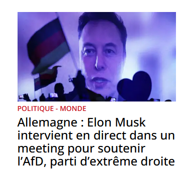 ![]() https://www.lanouvellerepublique.fr/a-la-une/allemagne-elon-musk-intervient-en-direct-dans-un-meeting-pour-soutenir-l-afd-parti-d-extreme-droite-1737828102