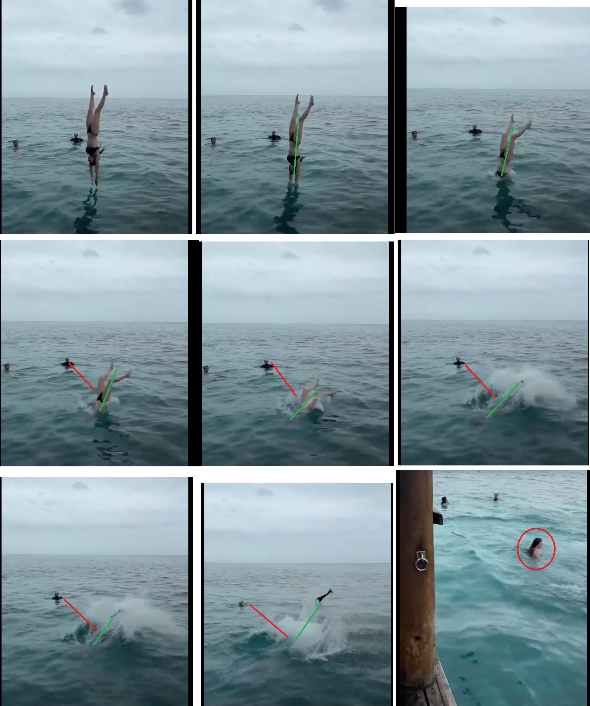Non non, elle a bien perdu le bas. Regarde la décomposition des images puis sa remontée (elle a le haut sur elle). ![]() On voit qu'elle n'entre pas droit dans l'eau (évolution du trait vert), si le haut avait sauté, ça vaut dire qu'il serait repassé par les jambes. Peu crédible. Et la forme du linge noir tout seul dans les airs ne ressemble pas à la forme du haut sur la première image. Et puis de toute façon, on voit bien le haut sur elle à la fin. ![]()