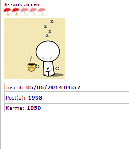 j'ai vue un membre avec 1998 messages et pas de statut spécial ![]() je m'attendais à voir le fameux 1.2.3...Zéro! ![]()