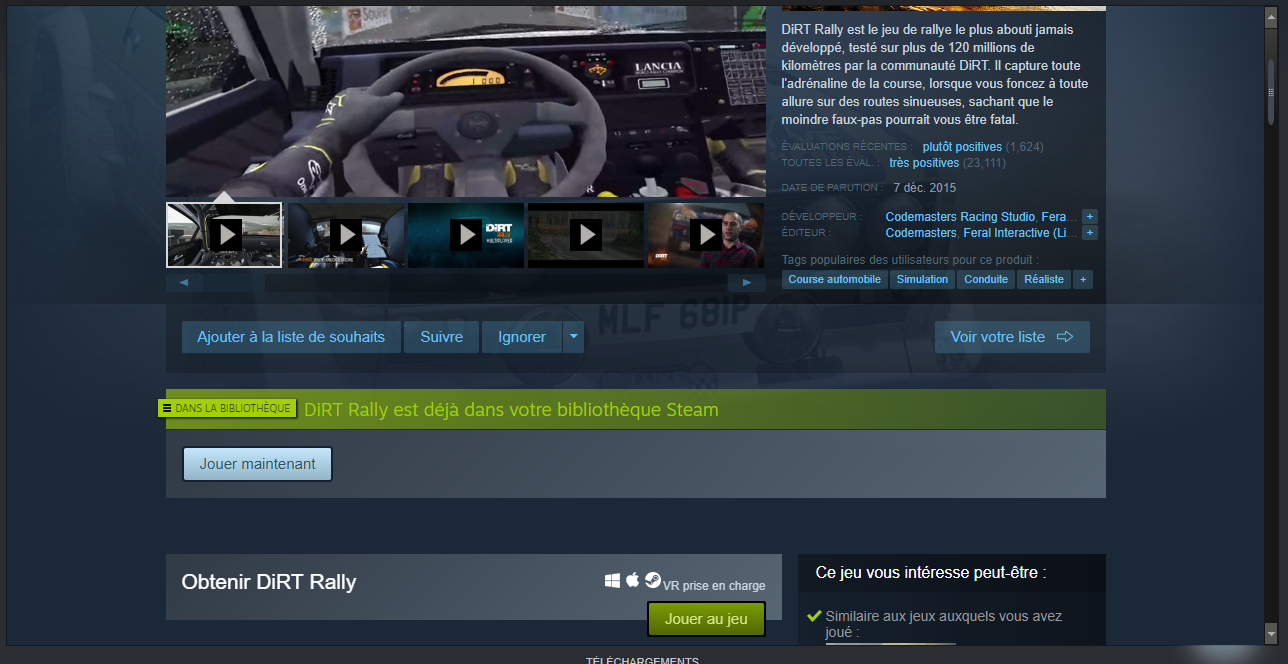 J'ai un problème avec Dirt Rally : j'ai cliqué sur "acheter" (ou je sais plus quoi) dans Steam. Il me dit que le jeu est dans ma bibliothèque, sauf qu'il n'y apparaît pas. Quand je retourne sur la page du magasin, j'ai ça : ![]() Mais si je cliquer sur "jouer", il lance très rapidement la fenêtre habituelle d'installation... mais elle disparaît en moins d'une seconde et plus rien. Edit : @Wiliwilliam Ah oui, pas pensé à vérifier sur le forum de Steam. Merci.^^
