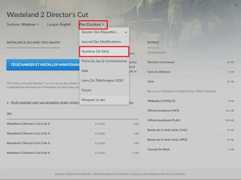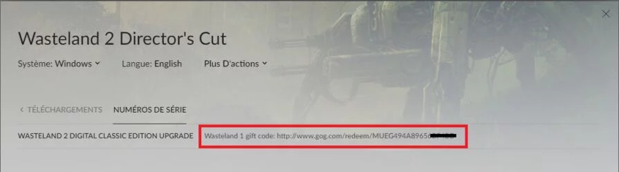 Pour cela il vous suffit de vous rendre sur la page gog.com/account, de cliquer sur l'icone de Wasteland 2, et dans le menu déroulant "Plus d'actions" vous devez cliquer sur "Numéro de série". Il y aura alors un lien URL que vous n'aurez qu'à copier dans la barre de recherche du navigateur pour activer votre licence gratuite. ![]() ![]()