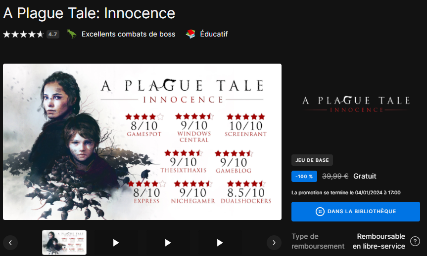 A Plague Tale Innocence Gratuit sur l'Epic Game Store jusqu'a demain