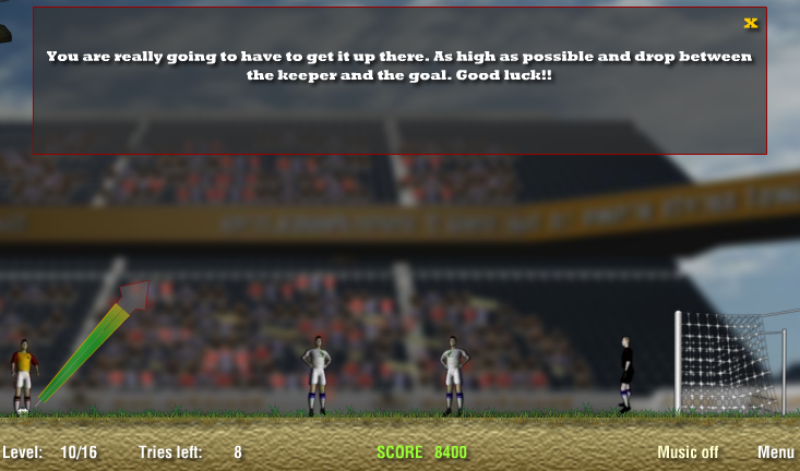 Marquez le but par niveau qui vous fera accéder au suivant en évitant les joueurs gris et en vous aidant avec les oranges. 16 niveaux avec seulement 20 essais en tout.