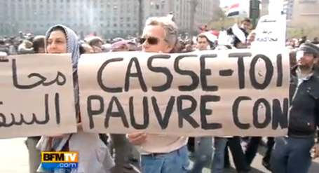 Pour marquer sa solidarité avec les manifestants de la place Tahrir, il a brandi une pancarte “Casse-toi pauvre con !”. Résultat, ce professeur du lycée français du Caire a été rapatrié par le Quai d'Orsay et sanctionné. Il aurait mieux fait de passer ses vacances en Dordogne…