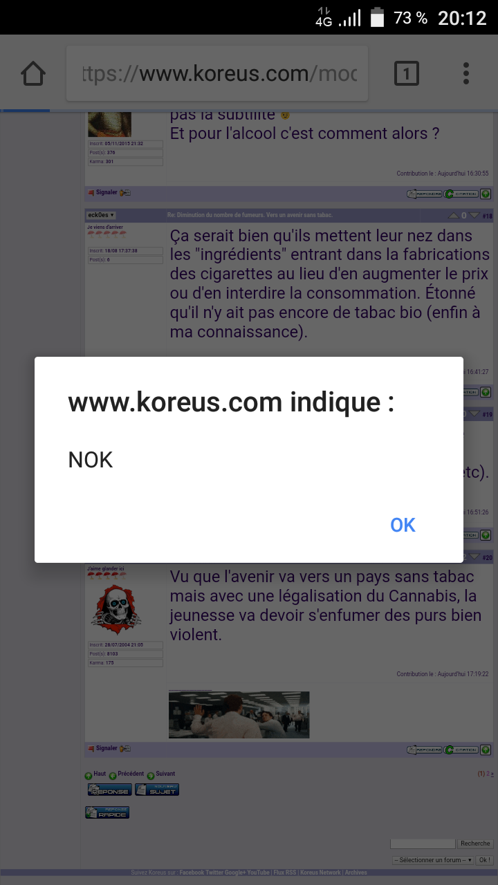 J'ai simplement cliquer sur le petit "2" du topic sur la cigarette en bas de page, pour aller à la seconde page. J'ai fais "OK" et recliquer sur le "2", ça m'a refait la même, avec une option cochable type "empécher cette page de générer de nouveau dialogue", j'ai coché et j'ai pu passer à la page 2 du topic.