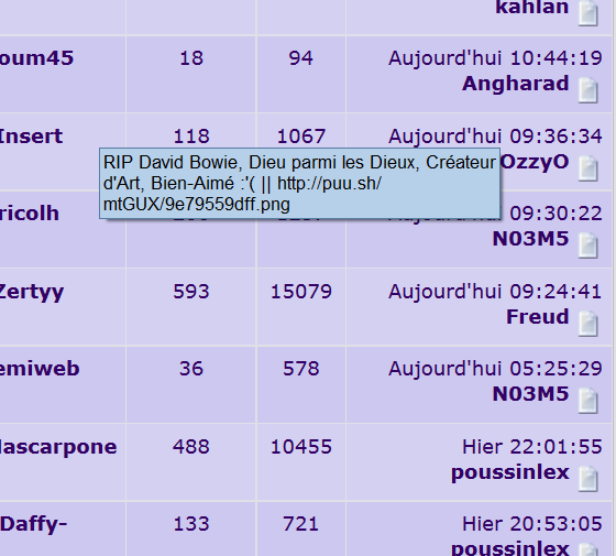 ![]() edit: d'ou vient ce message subliminal qui est rester que 3 sec à mon écran ? il n'y a que moi ? bowie !!! ![]()