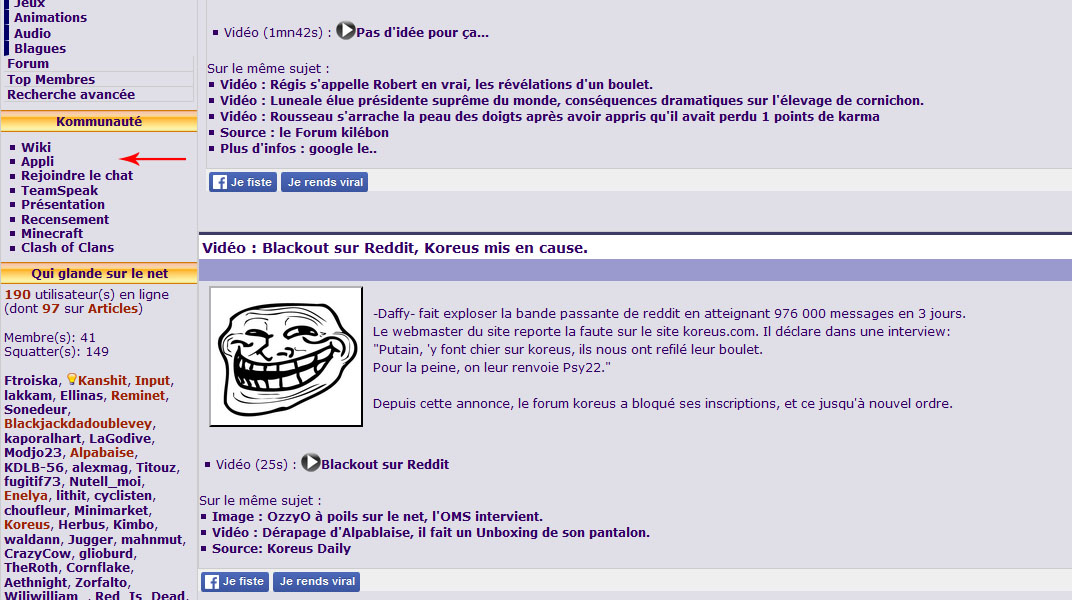 ![]() (hint: arguments) https://appli.koreus.com/classement.php j'ai presque fini le classement par le karma ![]() j'ai aussi rajouté la page de recensement dans le menu, n'hésitez pas à vous recenser http://www.koreus.com/recensement.php [EDIT : C'est bon le classement des 500 premiers karma est disponible ;-)]