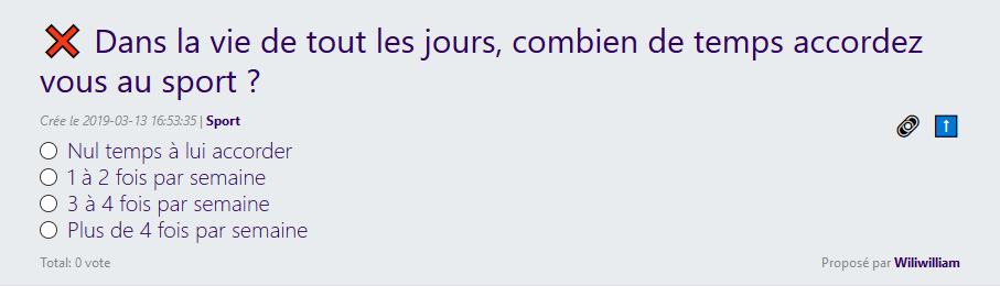 ![]() EDIT : @PurLio c'est fait, mais tu ne peux supprimer ton vote uniquement sur la page unique du sondage. (pour l'obtenir tu cliques sur l'emoji "lien") EDIT 2 : je me rends compte que c'est un bon moyen pour consulter les résultats des sondages sans participer.
