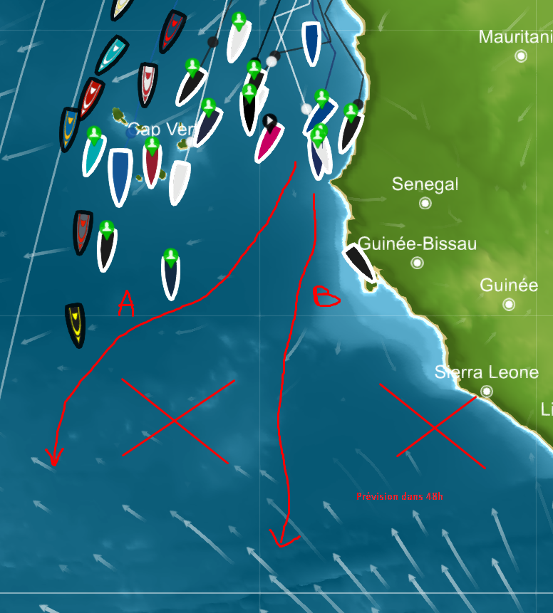 Hmm. Pas simple de répondre à ta question. Ça dépend de quand tu comptes partir vers le sud. Parce que, par exemple, si tu comptes venir aussi à l'ouest que moi (par exemple) je pense que ça ne sera pas rentable. Tu vas perdre trop de temps. Le soucis que je vois c'est qu'il y a deux zones de vent faibles à deux endroit qui se forment dans 48h et qui durent un peu (les deux croix dans l'image ci dessous). Donc pour passer à l'ouest des deux (option A), ça me semble compliqué vu ou tu es. J'ai l'impression (mais je peux me tromper, et les prévisions aussi ...) qu'il vaut mieux passer entre les deux, comme l'option B. ![]() Donc, ouais, pas simple de te répondre ^^. Si je devais faire un routage pour moi, je pense que je tenterais un truc comme ça : ![]() Mais après ça dépend aussi de ta disponibilité de combien de fois tu veux te connecter par jour.