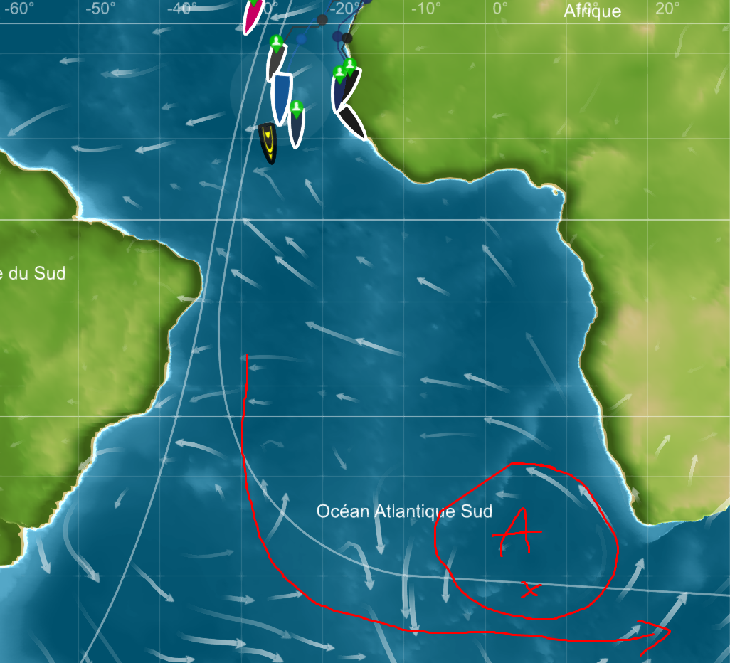 Dans les jours prochains, si vous avez choisis l'option de la côte, vous allez vraiment galérer. Vous allez vous retrouver dans le Pot aux noirs. Vu votre situation, il est trop tard pour mettre cap à l'ouest. Il va falloir zigzaguer entre les bulles d'absence de vent. Si je peux me permettre un conseil pour les jours prochains, filez vers le sud. Ne restez pas collé à la côte. ![]() Un peu dans ce genre, pour le cap général, tout en évitant les bulles sans vent jusqu'à l'équateur. Et même après, route au sud, en prévision de l’anticyclone de Saint Hélène. Pour répondre plus précisément à Wiliwilliam_ : Les seuls points de passages obligatoires sont aux niveaux du cap de bon espérance, du cap leuwin et du cap horn qu'il faut laisser à bâbord (passer au sud), et l'interdiction (pour raison de sécurité dans la vrai course, car beaucoup d'iceberg) de descendre en dessous du 60e parallèle (à vérifier, j'ai un doute sur le degré). Donc dans l'atlantique sud, tu peux passer par ou tu veux ! Cependant, je déconseille vraiment de filer au plus court (une diagonale qui irait à peu près de là ou on est vers le cap de bon espérance). A cause des système météo, très stable dans la région. Comme dans l'hémisphère nord, on a anticyclone des acores, dans le sud, il y a l’anticyclone de Saint-Hélène. Il se balade habituellement dans la zone que j'ai noté A ci dessous. Il vaut mieux le contourner par le sud, pour profiter du vent arrière qui nous portera d'ouest en est plus rapidement que de devoir tirer des bords pour avancer face au vent en le contournant par le nord. Alors bien sur, ce que je dis là, c'est pas nécessairement la meilleure solution, il peut y avoir des cas ou ce que je dis n'est pas vrai ... mais au vu des prévisions, pour le moment, nous ne sommes pas dans un de ces rares cas. Il vaut mieux donc passer par le sud, comme ma flèche l'indique. ![]() (la croix indique l’endroit ou est l'anticyclone présentement) Donc pour reprendre ce que tu dis, non, nous sommes pas obligé de suivre la ligne blanche, elle n'est juste pas placé par hasard, elle est la route la plus rapide en moyenne.