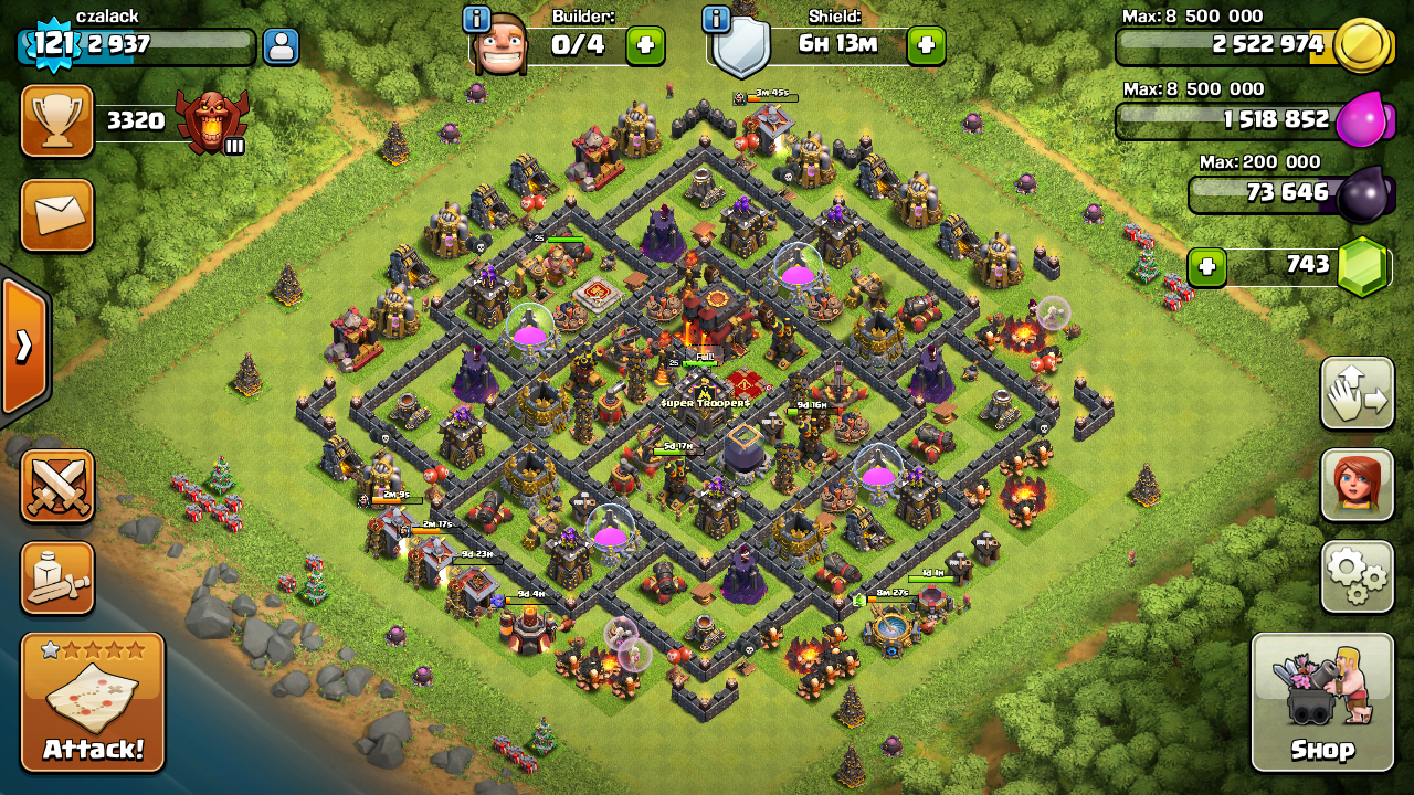 Toujours "actif" sur le jeu mais je suis en train de up mes murailles ... Depuis 3 mois x_x (et encore, je les monte qu'en version 200k/chaque) Du coup avec l'excédant d'ER, j'ai monté mes extracteurs d'EN et par ricochet mon Roi et ma Reine Maintenant, je crois que c'est carrément la dispo de mon village qui est moisi parce que je prends toujours aussi cher alors que j'ai monté bien 70% de mes défenses à fond (hormis les pièges et murailles) Mais je tiens bon!