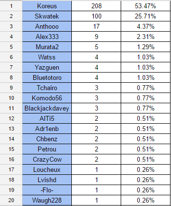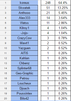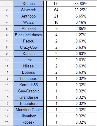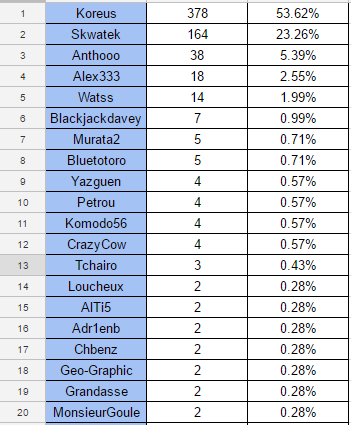 Je vais finalement mettre à jours ces statistiques tous les mois ici. Récapitulatif : En Janvier Koreusity c'est 4 vidéos: - Koreusity 217 (06/01) : 22m 57s / 85 éxtraits - Koreusity 218 (13/01) : 22m 55s / 93 éxtraits - Koreusity 219 (20/01) : 24m 51s / 107 éxtraits - Koreusity 220 (28/01) : 26m 42s / 104 éxtraits - Au total cela représente 389 éxtraits et 97 minutes de zap - Le Koreusity moyen de Janvier dure 24.4 minutes et est composé de 97 éxtraits de vidéo. - 35 personnes différentes ont participés au partages des vidéos - Les membres ont partagés 46.5% des vidéos présentes dans le zap, soit 181. Nombre de vidéos partagées par membre : Voici donc le top 20 des membres ayant partagés le plus de vidéos durant ce premier mois de 2017 ainsi que le pourcentage que cela représente. ![]() J'ai suivi le conseil de Wiliwilliam, pour éviter d'avoir à télécharger un fichier je l'ai créé en ligne sur Google Spreadsheets. Vous pouvez le consulter ici. Je compte mettre en place une liste de notifications pour les prochains mois, si ça interesse quelqu'un d'être prévenu(e) à l'arrivée des nouveaux stats, n'hésitez pas à me notifier ici ou à m'envoyer un mp ![]()