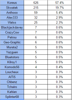 Statistiques Koreusity Fevrier 2017 Récapitulatif: En février, Koreusity c'est 4 vidéos: - Koreusity 221 (03/02) : 19m 51s / 80 extraits - Koreusity 222 (10/02) : 20m 49s / 78 extraits - Koreusity 223 (17/02) : 18m 27s / 71 extraits - Koreusity 224 (24/20) : 23m 05s / 87 extraits Ce qui nous fait un total de 82.2 minutes de zap et 316 extraits utilisés - En moyenne, un Koreusity dur 20.6 minutes et est composé de 79 extraits. - En Février 37 membres en plus de Koreus ont partagé des vidéos dont 24 ont partagé une vidéo dans le Koreusity pour la première fois de 2017. - Les membres ont partagés 46.20% des vidéos soit 146 extraits. Nombre de vidéos partagées par membre : Voici le top 20 des membres ayant posté le plus de vidéos durant le mois qui vient de s'écouler ainsi que le pourcentage que cela représente: ![]() Résumé de 2017 Récapitulatif: - Depuis le début de l'année nous avons eu droit à 8 zaps, pour une durée totale de 179.6 minutes (3heures) et pour un total de 705 extraits - Pour l'instant le Koreusity moyen de 2017 dure 22.5 minutes et est composé de 88 extraits - 59 personnes différents on contribué au Koreustity depuis le début de l'année - Les membres ont partagé 327 extraits soit 46.4% du total depuis le début de l'année Nombre de vidéos partagées par membre : Le top 20 des personnes qui ont le plus posté dans le zap pour les mois de Janvier et Février 2017 ![]() Le document utilisé pour le calcul de ces stats est consultable ici N'hésitez pas à me notifier ici ou à m'envoyer un mp si vous avez des suggestion ou si vous souhaitez que je vous notifie en fin de mois dès la sortie de ces stats ![]()
