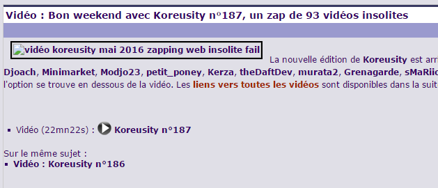 | Je poste trop    Inscrit: 07/07/2008 12:56 Post(s): 26241 Karma: 13552 | @Koreus  L'apercu de la vidéo du Koreusity 187 ne s'affiche pas sur la page d'accueil.  Edit : Et apparemment, tout comme les 3 autres articles suivants. Apres ca va
