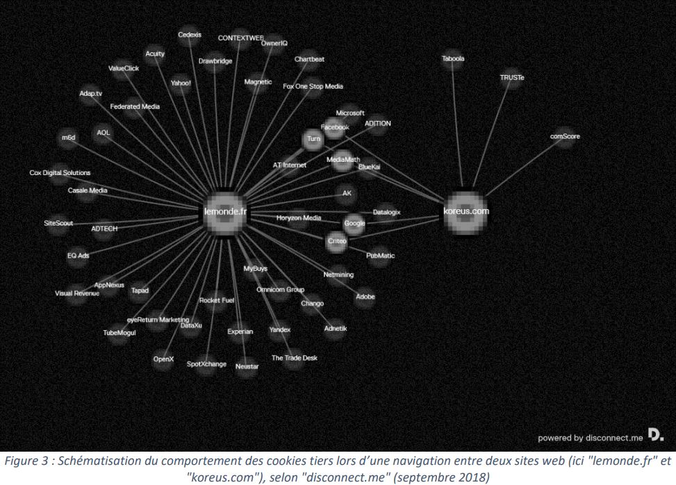Page 40, discussion sur la tracabilité de l'internaute, avec l'exemple d'un internaute allant du monde.fr à koreus.com Citation : Comme expliqué en fin de chapitre sur les origines de la communication numérique avec l’affaire DoubleClik par exemple, il y a une autre façon de récupérer d’autres données de notre activité sur Internet. Lors de navigation entre deux sites, des cookies sont laisser par des sociétés (site tiers, souvent des régies publicitaire) pour connaitre notre chemin de navigation. Concrètement, prenons un exemple d’une navigation entre le site "lemonde.fr" et le site de divertissement "koreus.com". Criteo, société parisienne de reciblage publicitaire****, est présente sur "lemonde.fr" et reçois une notification de notre présence dès que nous nous connectons. Criteo laisse ensuite un cookie à notre propos. Plus tard nous allons sur "koreus.com" et sans nous en rendre compte, Criteo y est aussi présente. Quelle facilité pour elle de savoir que nous sommes allées visiter ces deux sites dans la même journée ! Tant que nous allons sur des sites où le site tiers. Note : Je ne sais pas juger de la valeur de ce qui y est dit. Me semble que y a beaucoup de fautes d'orthographes